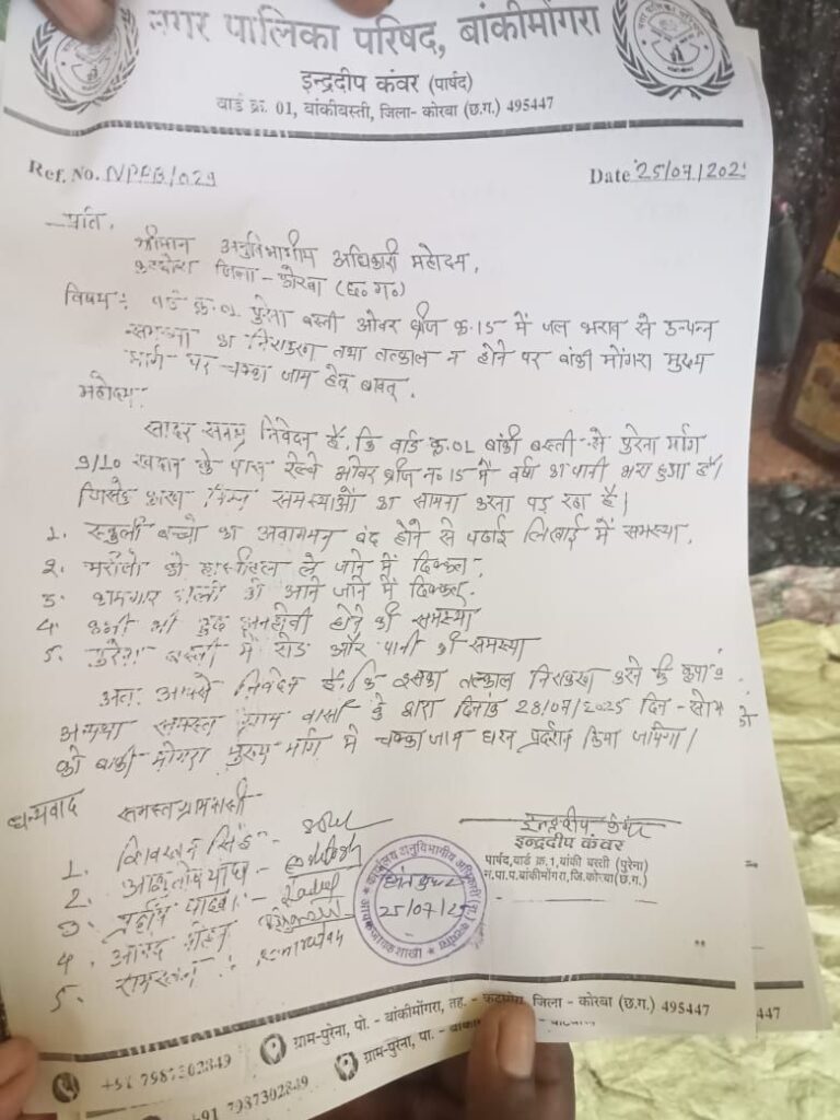 पालिका अधिकारी को ज्ञापन सौंपकर जल्द से बनीं समस्या को दूर करने की निवेदन किया है । समस्या का समाधान नहीं होने पर 28 जुलाई 2025 को वार्ड पार्षद अपने वार्डवासियों के साथ बांकीमोंगरा के मुख्य मार्ग में चक्काजाम व धरना प्रदर्शन करेंगे ।