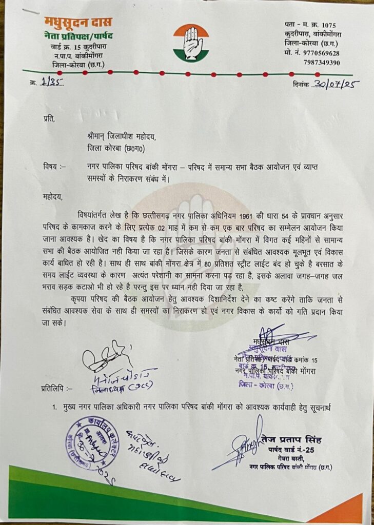 इस अवसर पर नेता प्रतिपक्ष मधुसूदन दास ने कहा कि – छत्तीसगढ़ नगर पालिका अधिनियम ,1961 की धारा 54 के प्रावधान के अनुसार परिषद के काम काज करने के लिए प्रत्येक 2 माह में कम से कम एक बार सम्मेलन करवाना आवश्यक है,खेद का विषय है की बांकीमोंगरा नगर पालिका परिषद विगत कई महीनों से सामान्य सभा की बैठक आयोजित नहीं किया जा रहा है । जिसके कारण जनता से संबंधित आवश्यक मूलभूत और विकास कार्य बाधित हो रही है ।