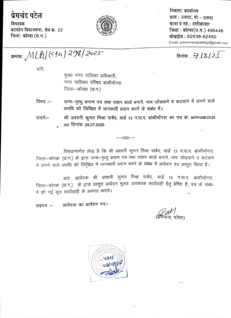 कटघोरा विधायक प्रेमचंद पटेल ने पार्षद अश्वनी मिश्रा के पत्र को संज्ञान में लेते हुए बांकीमोंगरा पालिका अधिकारी से मांगा जवाब ।