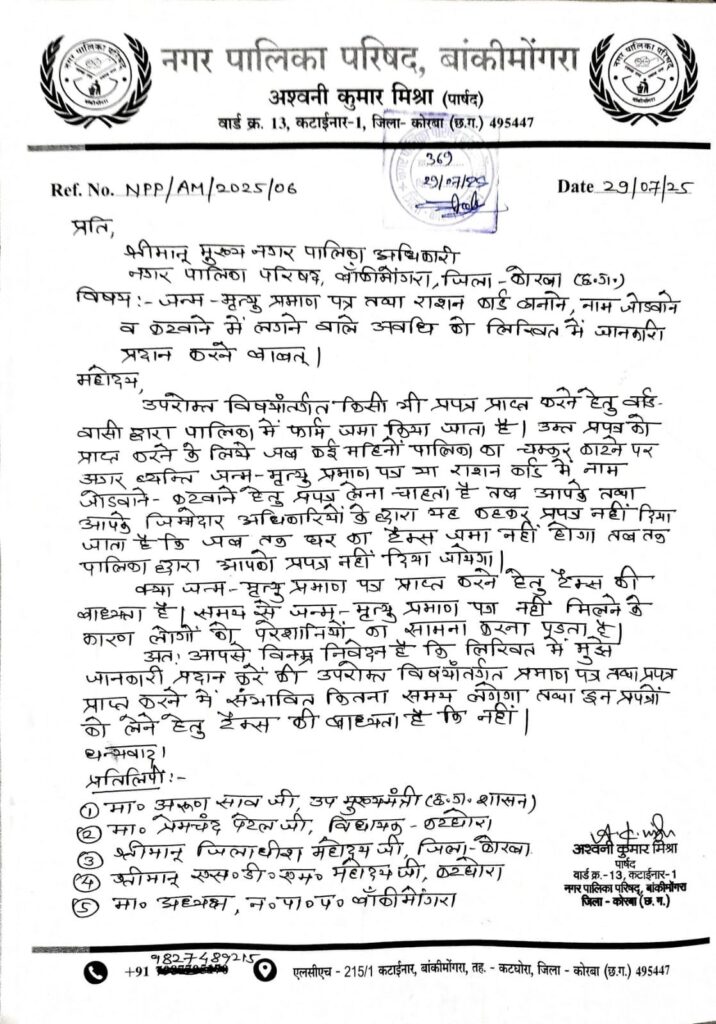 छत्तीसगढ़/कोरबा जन्म – मृत्यु प्रमाण पत्र व राशन कार्ड बनाने के लिए नगरी निकाय से लेकर ग्राम पंचायत में व्यवस्था निश्चित है । लेकिन कोरबा जिले के नगर पालिका परिषद बांकीमोंगरा में अलग ही नियम है , इसके अन्तर्गत आवेदन करने वाले लोगों को प्रपत्र देने के लिए पहले बकाया टैक्स का भुगतान करने को कहां जाता है , इस तरह से नियम को लोगों में नाराजगी है । दिनांक 29/07/2025 को नगर पालिका परिषद बांकीमोंगरा अन्तर्गत वार्ड क्रमांक 13 कटाईनार-1 पार्षद अश्वनी मिश्रा ने इस संबंध में मुख्य नगर पालिका परिषद बांकीमोंगरा को पत्र सौंपकर लिखित में जानकारी मांगा है, और कहां कि क्या ऐसी कोई बाध्यता इस मामले को लेकर सरकार के नगरी प्रशासन विभाग के द्वारा बनाई गई है । उन्होंने पत्र के माध्यम जानकारी मांगा कि इस प्रकिया में आखिर कितना समय लगेगा , ताकि लोगों को परेशानियों से मुक्ति मिल सके । मिश्रा ने कहा कि विभिन्न क्षेत्रों से इस प्रकार की शिकायतें आ रही है , जो लोग राशन कार्ड से लेकर जन्म और मृत्यु का पंजीयन करने व इन मामलों में प्रमाण पत्र जारी करने की मांग कर रहे हैं । उन्हें यही तर्क दिया जा रहा है कि पहले बकाया टैक्स जमा किया जाए , टैक्स जमा करने पर ही प्रकिया पुरी किया जा रहा है । इसके अलावा राशन कार्ड में नये सदस्यों के नाम व किसी का नाम विलोपित करने के लिए भी यही तर्क दिया जा रहा है । अश्वनी मिश्रा ने पालिका अधिकारी को बताया कि इस तरह के नये और असाधारण नियम के कारण काफी लोग पालिका कार्यालय का चक्कर काटने को मजबूर हैं । लोगों को जितनी जानकारी है इसके हिसाब से कोरबा जिले के दुसरे नगरी निकायों में ना तो ऐसा कोई नियम बना है और ना ही इसके लिए उन्हें चक्कर लगवाए जा रहे हैं । पार्षद अश्वनी मिश्रा ने इसकी जानकारी जिले के प्रभारी मंत्री अरुण साव , केबिनेट मंत्री लखन लाल देवांगन , कलेक्टर कोरबा , कटघोरा विधायक प्रेमचंद पटेल को भी अवगत कराया है । उन्होंने कहा कि सरकारी कार्यालय में जनता के कम आसान तरिके से हो इसके लिए कई प्रकार की चीज विकेंद्रीकरण की गई है । वहीं वार्ड क्रमांक 13 कटाईनार-1 पार्षद अश्वनी मिश्रा द्वारा नगर पालिका परिषद बांकीमोंगरा के पालिका को दिये गए पत्र को संज्ञान में लेते हुए कटघोरा विधायक प्रेमचंद पटेल ने भी पालिका अधिकारी को पत्र जारी किया है । विधायक प्रेमचंद पटेल ने अपने पत्र में कहा कि अश्वनी कुमार मिश्रा पार्षद वार्ड क्रमांक 13 कटाईनार-1 नगर पालिका परिषद बांकीमोंगरा जिला कोरबा द्वारा जन्म – मृत्यु प्रमाण पत्र तथा राशन कार्ड बनाने , नाम जोड़वाने व कटवाने में लगने वाले अवधि को लिखित में जानकारी प्रदान करने के संबंध में आवेदन पत्र प्रस्तुत किया जाए ।