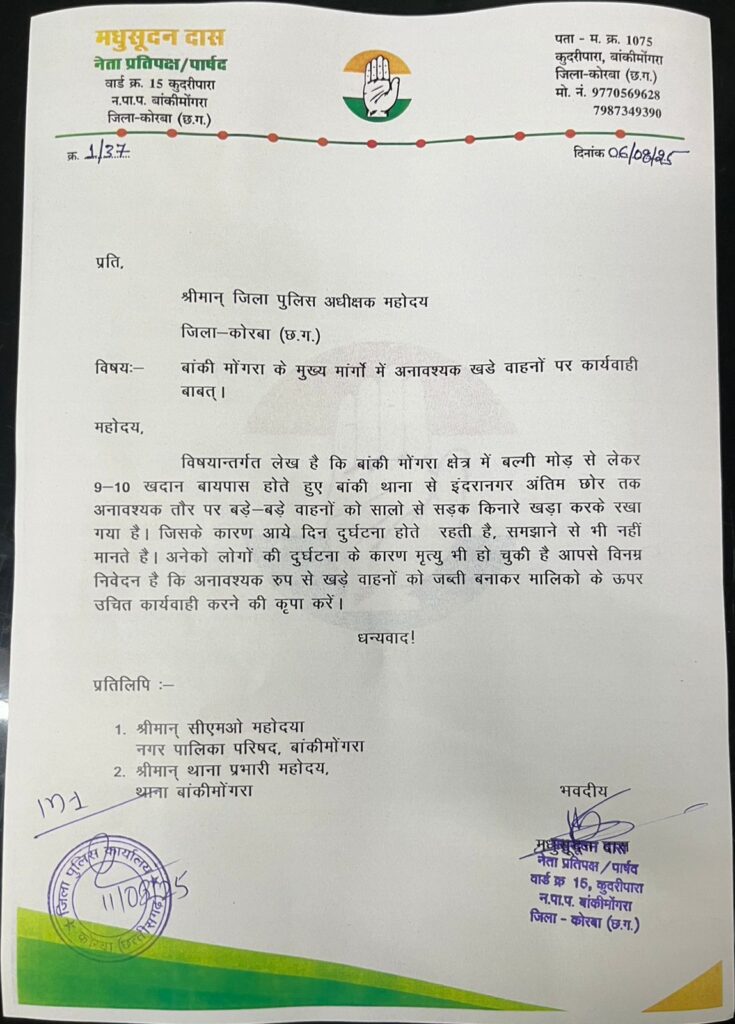 छत्तीसगढ़/कोरबा बांकीमोंगरा नगर पालिका के नेता प्रतिपक्ष मधुसूदन दास ने कोरबा ज़िला पुलिस अधीक्षक को पत्र देकर माँग की है की बांकीमोंगरा नगर पालिका क्षेत्र के बल्गी मोड़ से लेकर 9-10 खदान बायपास होते हुए इंद्रानगर चौक तक अवैध रूप से खड़े सड़क किनारे वर्षों से बड़े वाहन जो केवल दुर्घटना का कारण बन रहे है उन सभी वाहनो को जप्ती बनाकर मालिकों के ऊपर उचित कार्यवाही की माँग की गई है ।