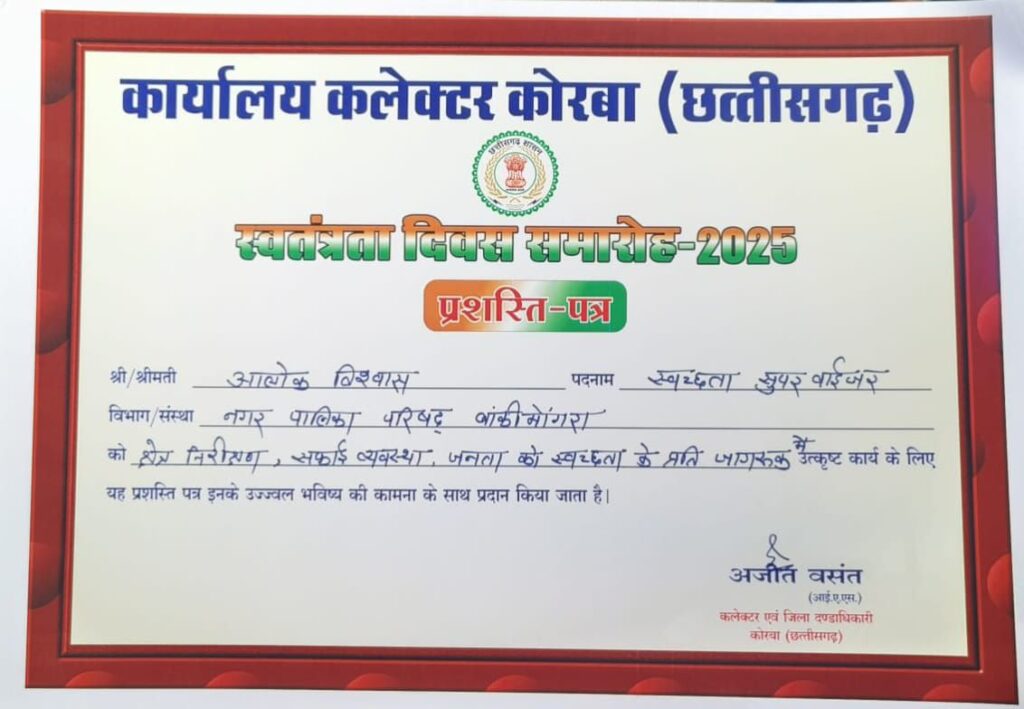 इसी कड़ी में बांकीमोंगरा नगर पालिका परिषद में कार्यरत स्वच्छता सुपरवाइजर आलोक विश्वास को अनेक उत्कृष्ट कार्यों के लिए