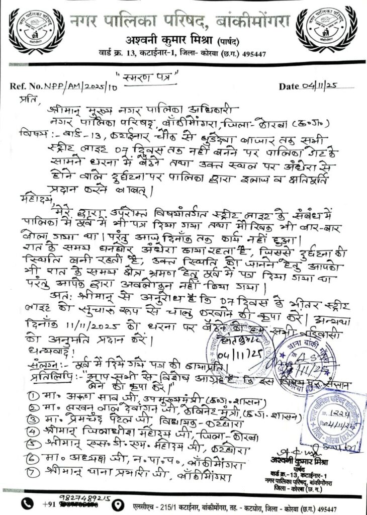 जिसके वजह एक बार फिर ज्ञापन सौंपकर चेतावनी दी है कि 7 दिवसीय के अंदर अंधेरे को उजाला नहीं किया गया तो 11 नवंबर को बांकीमोंगरा पालिका परिषद के बाहर पार्षद अश्वनी कुमार मिश्रा अपने वार्डवासियों के साथ धरने में बैठेंगे। फिलहाल अब देखना होगा कि पार्षद अश्वनी कुमार मिश्रा द्वारा चेतावनी व दिये ज्ञापन में क्या असर पड़ता है, या उसे भी पालिका अधिकारी दरकिनार कर धरने जैसे चेतावनी को जिम्मेदारी लेंगे।