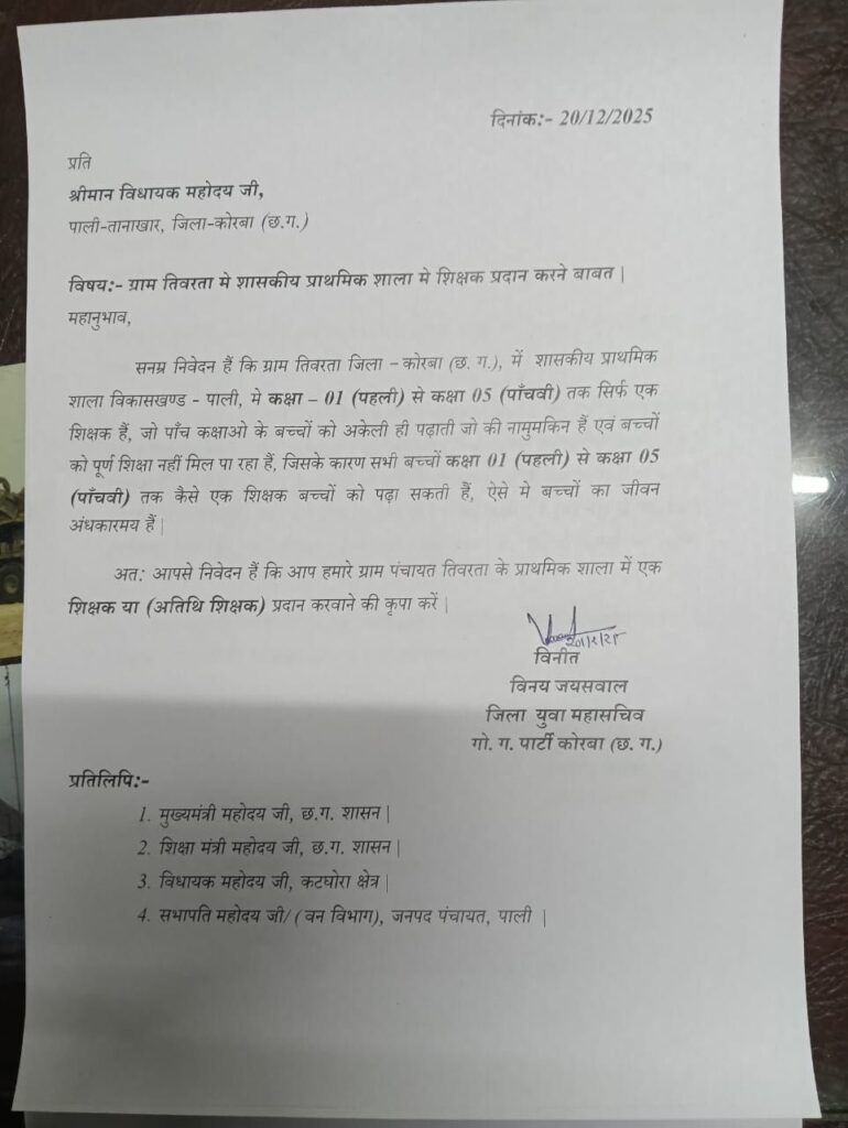 कोरबा/दीपका:- ग्राम पंचायत तिवरता में निवास करने वाले समाज सेवक विनय जायसवाल के द्वारा क्षेत्रीय विधायक प्रेमचंद पटेल को पत्र लिखकर मांग किया गया है कि ग्राम तिवरता में संचालित गवर्मेंट प्राइमरी स्कूल में कक्षा 5 वीं तक पूरे स्कूल में केवल एक ही शिक्षक पदस्थ हैं। इसके कारण पूरे स्कूल की जिम्मेदारी वहन करना संभव नहीं हो पाता। जिससे बच्चों की पढ़ाई प्रभावित न हो, इसलिए प्राथमिक शाला तिवरता में शिक्षक पदस्थापना करनी जरूरी है।