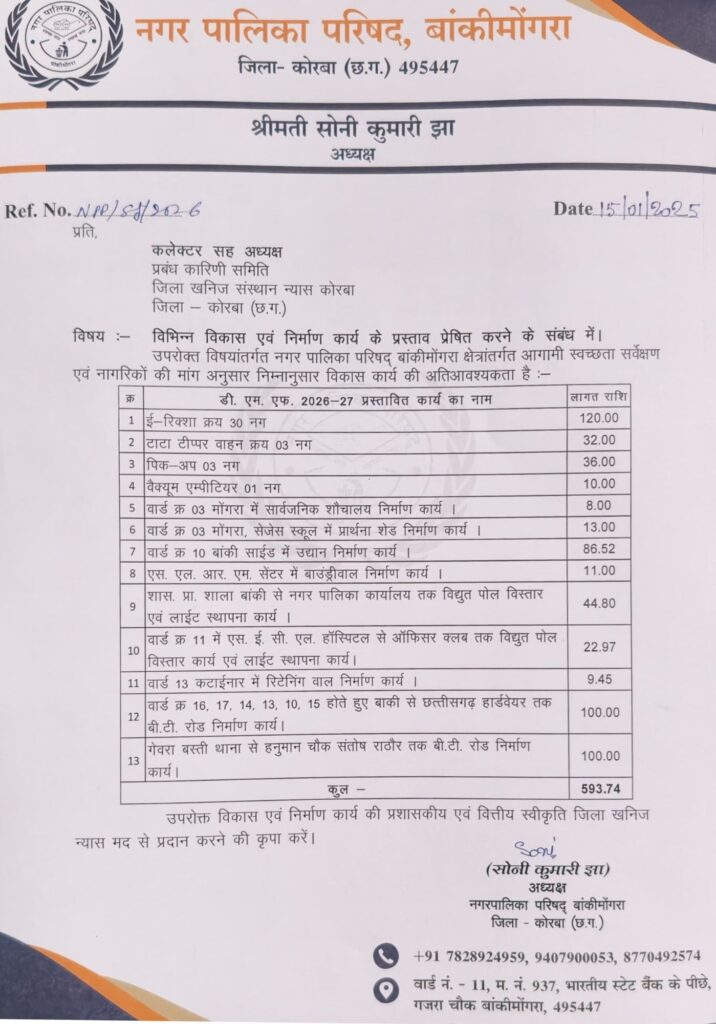 जिसमें ई- रिक्शा, टाटा टीपर वाहन, पिकअप, वैक्यूम एम्पीटियर , वार्ड क्रमांक 3 में सार्वजनिक शौचालय निर्माण कार्य, वार्ड क्रमांक 3 मोंगरा सेजेस स्कूल में प्रार्थना शेड , वार्ड क्रमांक 10 बाकी साईड में उघान, एस.एल.आर.एम.सेंटर में बाउंड्रीवाल , शा.प्रा.शाला बाकी से नगर पालिका कार्यालय तक विद्युत पोल विस्तार एवं लाईट स्थापना, वार्ड क्रमांक 11 में एसईसीएल अस्पताल से ऑफिसर क्लब तक विद्युत पोल विस्तार एवं लाईट स्थापना कार्य, वार्ड क्रमांक 13 कटाईनार में रिटर्निंग वाला निर्माण कार्य, वार्ड क्रमांक 16, 17, 14, 13, 10, 15 होते हुए बाकी से छत्तीसगढ़ हार्डवेयर तक बी.टी रोड़ निर्माण कार्य, गेवरा बस्ती के कुसमुंडा थाना से हनुमान चौक संतोष राठौर तक बी.टी. रोड़ निर्माण कार्य शामिल हैं। एवं अन्य वार्डों में विकास कार्यों को लेकर चर्चा किया गया‌