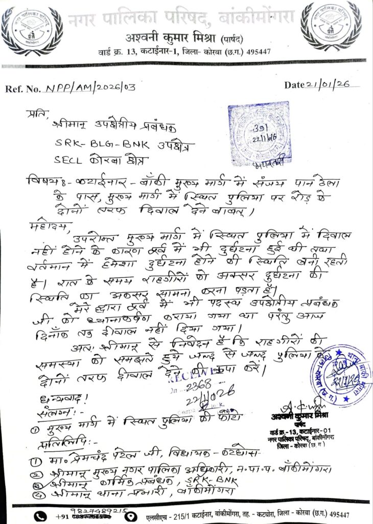ज्ञापन सौंपते हुए पार्षद अश्वनी मिश्रा ने SECL के अधिकारियों का ध्यान इन बिंदुओं की ओर आकर्षित कराया कि क्षतिग्रस्त पुल की मरम्मत का कार्य प्राथमिकता के आधार पर शुरू किया जाए।
