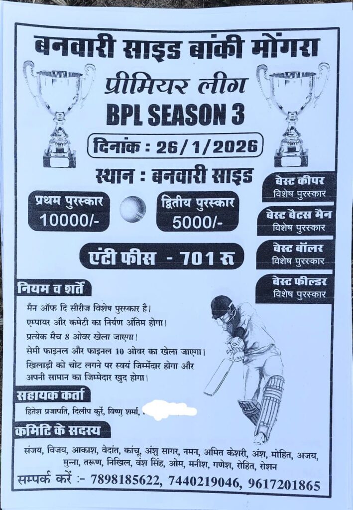 नगर पालिका परिषद बांकीमोंगरा अन्तर्गत वार्ड क्रमांक 09 अंबेडकर नगर के बनवारी साइड में आज से प्रीमियम लीग BPL SEASON 3 क्रिकेट प्रतियोगिता शुरू की है। इस कार्यक्रम की शुरुआत मुख्य अतिथि दिलीप कुर्रे पार्षद प्रतिनिधि एवं विशिष्ट अतिथिगण हितेश प्रजापति,विष्णु शर्मा,राजेश राजपूत,छोटेलाल आजाद, बबलू सरदार,मनहरण सूर्यवंशी,लाल बिहारी ने पूजा अर्चना कर व लाल फीता काटकर खेल की शुरुआत की गई। इस प्रतियोगिता में खिलाड़ियों के लिए प्रथम पुरस्कार 10,000 एवं द्वितीय पुरस्कार 5,000 रखा गया है। एंट्री फीस 701 साथ ही बेस्ट कीपर,बेस्ट बैटर मैन,बेस्ट बॉलर,बेस्ट फिल्डर को विशेष पुरस्कार दिया जाएगा। इस कार्यक्रम के आयोजनकर्ता सदस्यों के नाम के नाम इस तरह है संजय शाहू,विजय,आकाश,वेदांत, कांचू,अंशु,सागर,नमन, अमित केशरी, बंटी, शनि,रवि यादव,राजेश कुमार,राजा ठाकुर,गुड्डू,अंश,मोहित,अजय,मुन्ना,तरुण,निखिल,वंश,सिंह, ओम,मनीष,गणेश,रोहित,रोशन इत्यादि है। साथ ही नगर एवं जिले से खिलाड़ियों को आमंत्रित किया गया है।