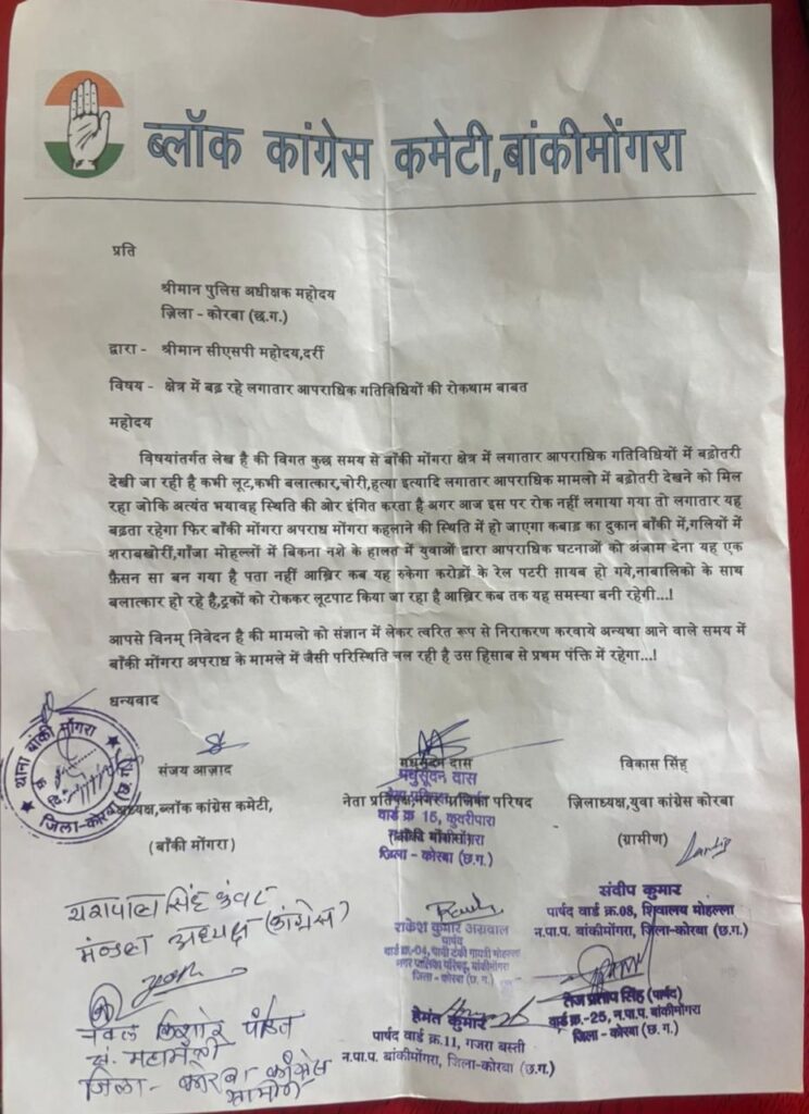 मामलो को संज्ञान में लेकर त्वरित रूप से निराकरण करवाने की माँग कि गई एव आने वाले समय में बांकीमोंगरा अपराध के मामले में जैसी परिस्थिति चल रही है उस हिसाब से प्रथम पंक्ति में रहेगा।