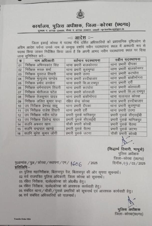 छत्तीसगढ़/कोरबा नगरीय निकाय चुनाव के बाद जिला पुलिस अधीक्षक ने एक बार फिर जिले कई थाना प्रभारियों सहित पुलिस स्टाफ को इधर से उधर भेजा गया । देखें लिस्ट में किसको कहा भेजा गया ।