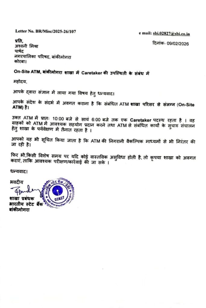 छत्तीसगढ़/कोरबा बांकीमोंगरा क्षेत्र के एसबीआई बैंक के समीप एटीएम (ATM) केंद्र में सुरक्षा और व्यवस्था को लेकर लंबे समय से चली आ रही समस्या का अब समाधान होने जा रहा है। बांकीमोंगरा के वार्ड क्रमांक 13 कटाईनार पार्षद अश्वनी मिश्रा की जनहित से जुड़ी मांग को बैंक प्रबंधन ने गंभीरता से लेते हुए एटीएम केंद्र पर केयरटेकर तैनात करने का निर्णय लिया है।