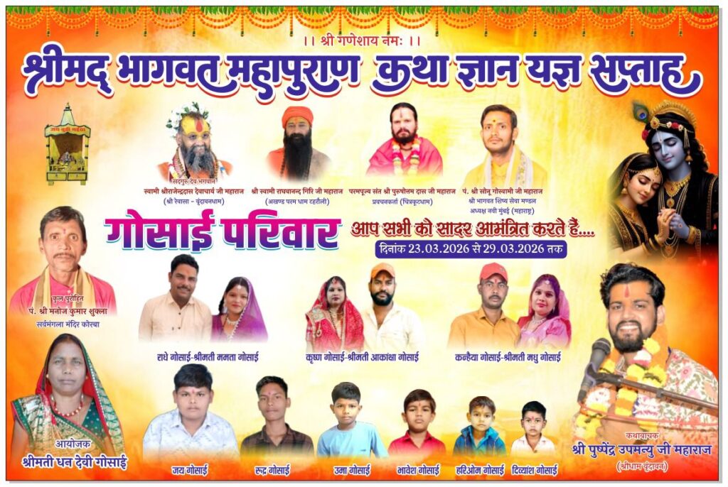 छत्तीसगढ़/कोरबा जिले कुसमुंडा क्षेत्र के कूचेना दादर पारा में राधे गोसाईं के माता जी श्रीमती धन देवी गोसाईं द्वारा हर साल श्री मद भागवत कथा का आयोजन किया जाता है। जो कि इस वर्ष भी 23/03/2026 से 29/03/2026 तक भव्य रूप से श्री मद भागवत कथा हुआ 29/03/2026 को सु प्रसिद्ध छत्तीसगढ़ के गायक मनीष मनचला का जागरण भी किया गया । जिसमें सैकड़ों की संख्या में लोगों ने कथा का आनंद लिया। जिसमें कुसमुंडा क्षेत्र में गोसाईं परिवार की प्रशंसा की जा रही है