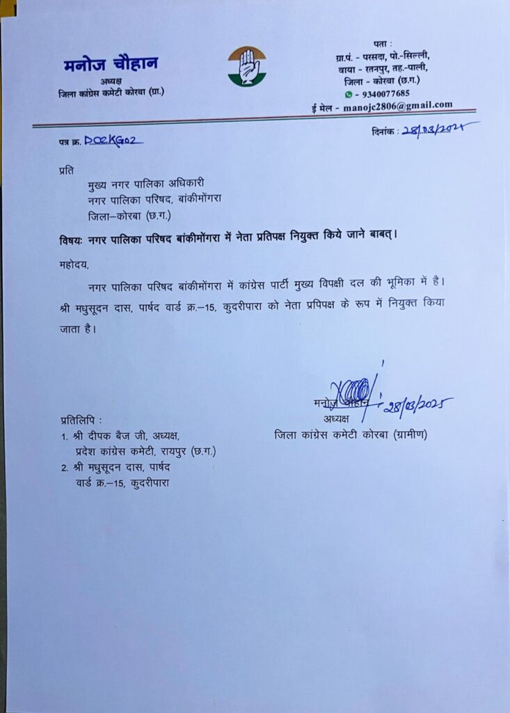 छत्तीसगढ़/कोरबा जिले के नगर पालिका परिषद बांकीमोंगरा में सदन का नेता नियुक्त कर नेता प्रतिपक्ष की जिम्मेदारी पार्षद मधूसुदन दास को सौंपी है । कांग्रेस जिलाध्यक्ष ग्रामीण मनोज चौहान ने इस आशय का आदेश जारी किया है । मधुसूदन दास ने इसके लिए नेता प्रतिपक्ष छत्तीसगढ़ विधानसभा डॉ. चरणदास महंत के स्नेह, सहित सांसद श्रीमती ज्योत्सना महंत, प्रदेश कांग्रेस के अध्यक्ष दीपक बैज, पूर्व विधायक पुरुषोत्तम कंवर, सहित हरीश परसाई, प्रशांत मिश्रा, कांग्रेस कमेटी के जिलाध्यक्ष मनोज चौहान के प्रति आभार जताया है । सभी को विश्वास दिलाया है कि बांकीमोंगरा नगर पालिका में सदन के नेता के अपने कर्तव्यों और दायित्वों का निर्वहन सम्पूर्ण समर्पण के साथ करूंगा एवं जनहित के हर एक मामले में निष्पक्ष एवं निर्भीक रूप से निराकरण हेतु सदैव प्रयासरत रहूंगा ।